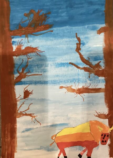 Die Schülerinnen und Schüler der 5d und 5e haben im Kalt-warm-Kontrast eine Waldszene gestaltet. Zuerst wurde ein gleichmäßiger Farbverlauf im Hintergrund angelegt, bevor zwei Bäume und ein Feuervogel oder anderen Waldbewohner in warmen Rottönen hinzu kamen. Dankeschön fürs Veröffentlichen,