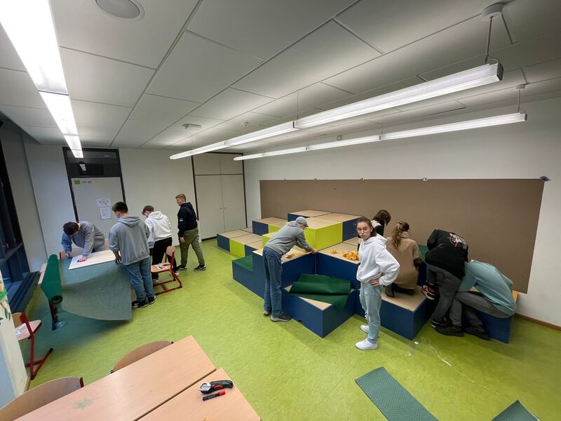 Was passiert da nur im Raum 01.65 auf dem Flur des 5. Jahrgangs? Das fragten sich seit ein paar Wochen die Schüler*innen. Da wurde gesägt und gebohrt, verschraubt und Teppiche zugeschnitten und auf Holzelemente getackert. Es wurde fleißig gefegt, gebastelt und geschmückt.