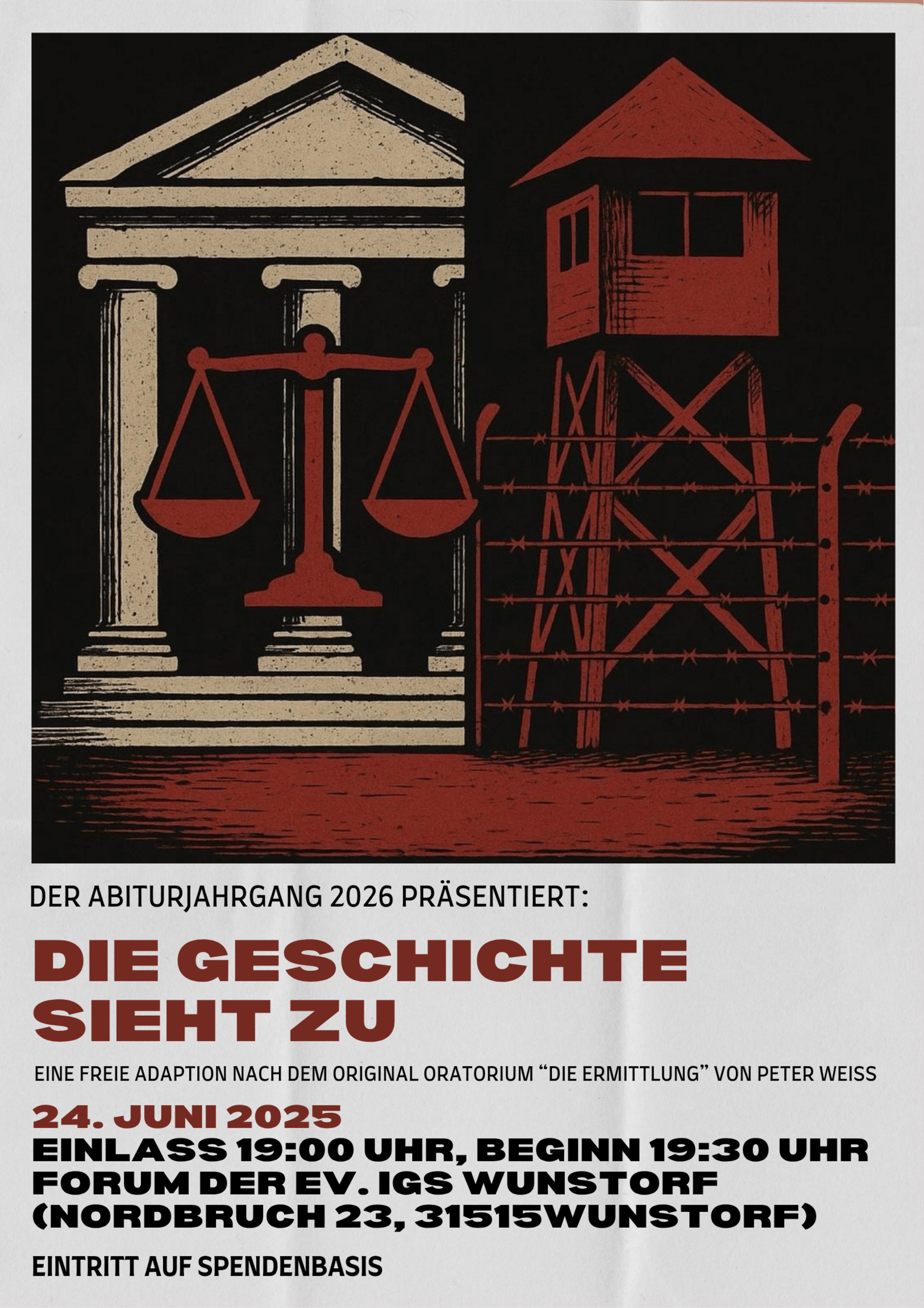 Der 12. Jahrgang lädt alle Interessierten zu ihrer Aufführung am 24.06.2025 ein. Der Einlass ist um 19:00 Uhr, der Beginn des Stückes um 19:30 Uhr. Die Dauer des Stückes beträgt (inklusive Pause) ca. 90 Minuten. Der Eintritt ist auf Spendenbasis und dient dem Abiturjahrgang 2026 für ihre Feierlichkeiten.