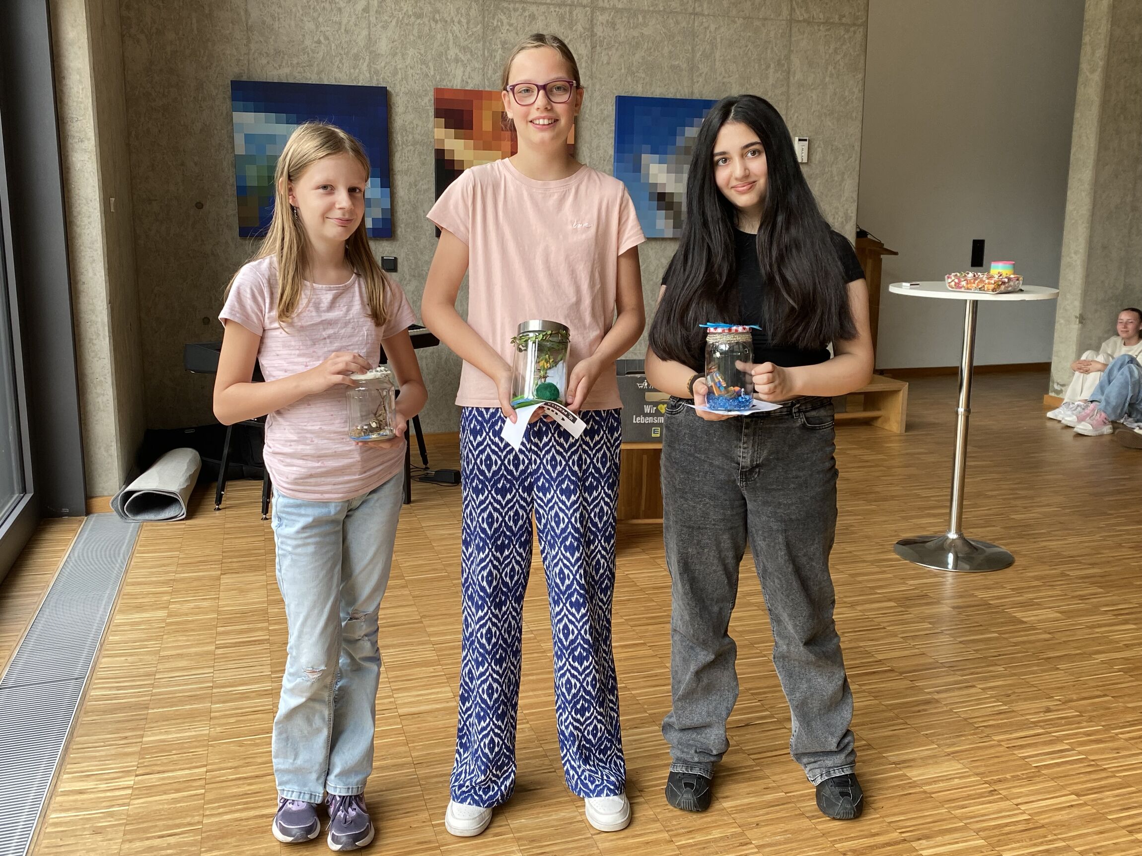 Am 24.6.25 haben die Schüler*innen der Religionskurse in JG 5 das beste Psalmglas des Jahrgangs prämiert. Nachdem im Vorfeld innerhalb der Klassengemeinschaft die besten 5 ausgewählt worden waren, wurden am Dienstag aus den besten 25 Gläsern die Gewinner ermittelt. Alle Schüler*innen der Religionskurse hatten ein Stimmrecht. Gratulieren können wir Lotta (5d), die den ersten Platz belegte, gefolgt von Ayla (5d) auf dem zweiten Platz und Marta (5c) auf dem dritten Platz. Alle Gewinnerinnen erhielten als Belohnung einen kleinen Gutschein für unser Kiosk. Herzlichen Glückwunsch!