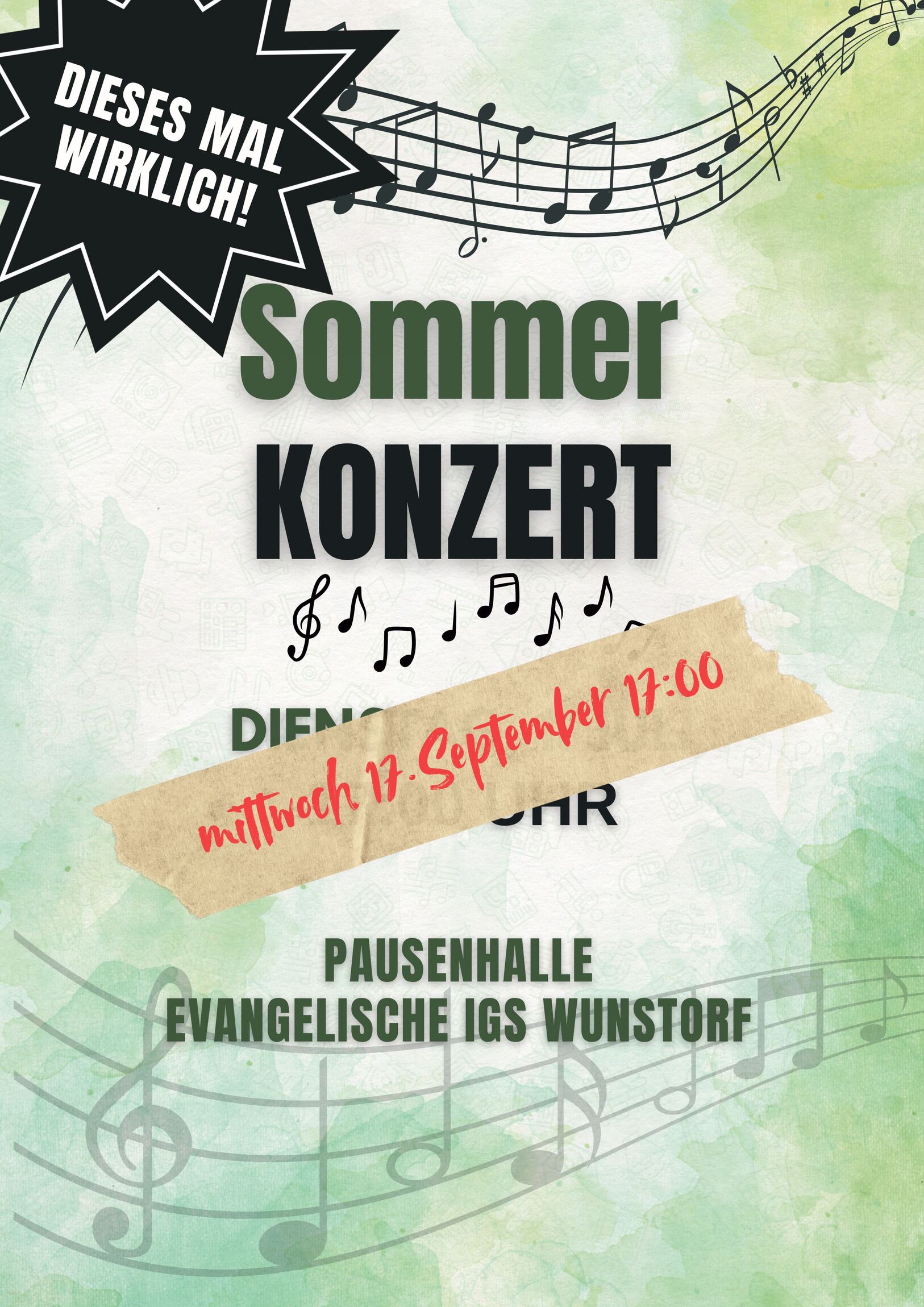 Nachdem das Sommerkonzert vor den Sommerferien wegen Hitze ausfallen musste, findet es nun am Mittwoch, 17. September, in der Pausenhalle unserer Schule statt. Nun aber wirklich :-) ... Wir freuen uns auf viele Zuschauer und danken Hubertus Senff und Nelio Gioia aus der 10e für die Gestaltung des Posters.