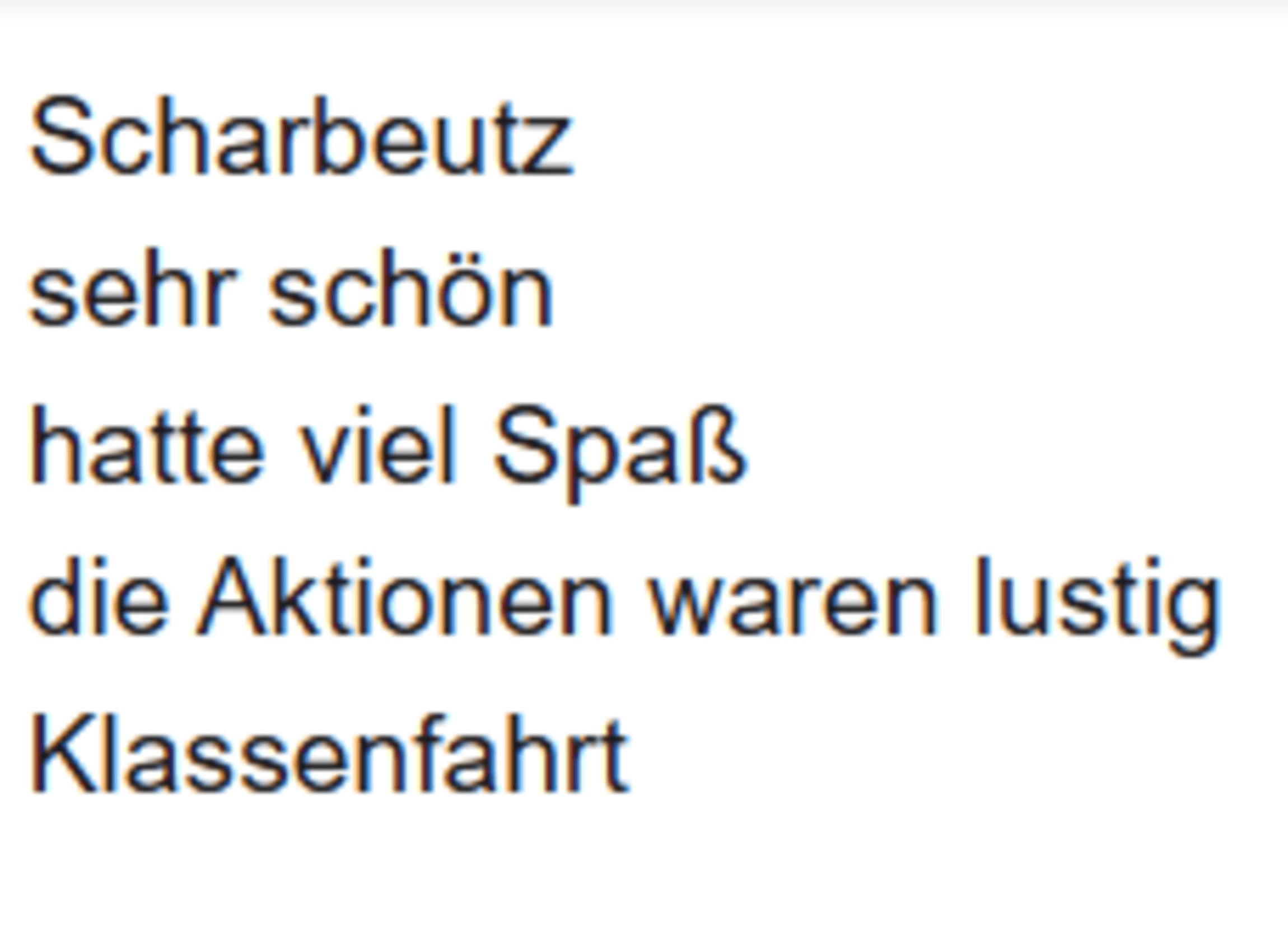 Die Stimmung während der gesamten Klassenfahrt war fröhlich, entspannt und fast wie im Urlaub. Das abwechslungsreiche Programm, die schöne Gemeinschaft und die besondere Lage der Jugendherberge machten die Tage in Scharbeutz zu einem Highlight. Die Jugendherberge ist aufgrund ihrer Ausstattung und der unmittelbaren Strandnähe sehr empfehlenswert.