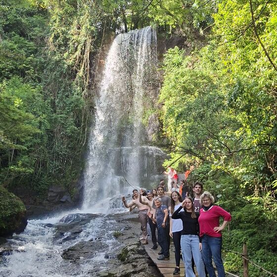 Wir sind eine kurze Strecke auf der Landstraße gefahren um dann auf einen Waldweg zu kommen, ab da durften wir auch auf dem Dach des Vans oben drauf sitzen. Diese Erfahrung war für uns alle einmalig und ein absolutes Highlight der ganzen Reise. Vom Dach aus war die Aussicht auf das Gebirge von San Miguel sehr überwältigend. Man konnte die Natur gut überblicken und das Wetter war angenehm sonnig. An unserem ersten Zwischenstopp angekommen, haben wir die Bullis stehen gelassen und sind in den Wald gewandert. Nach schon wenigen Minuten sind wir an unserem ersten Ziel angekommen: ein Wasserfall. Dieser war wirklich wunderschön und sehr beeindruckend, das Wasser war ziemlich klar und einige von uns sind auch schwimmen gegangen. Danach sind wir zum nächstgelegenen Wasserfall oberhalb des anderen gegangen.