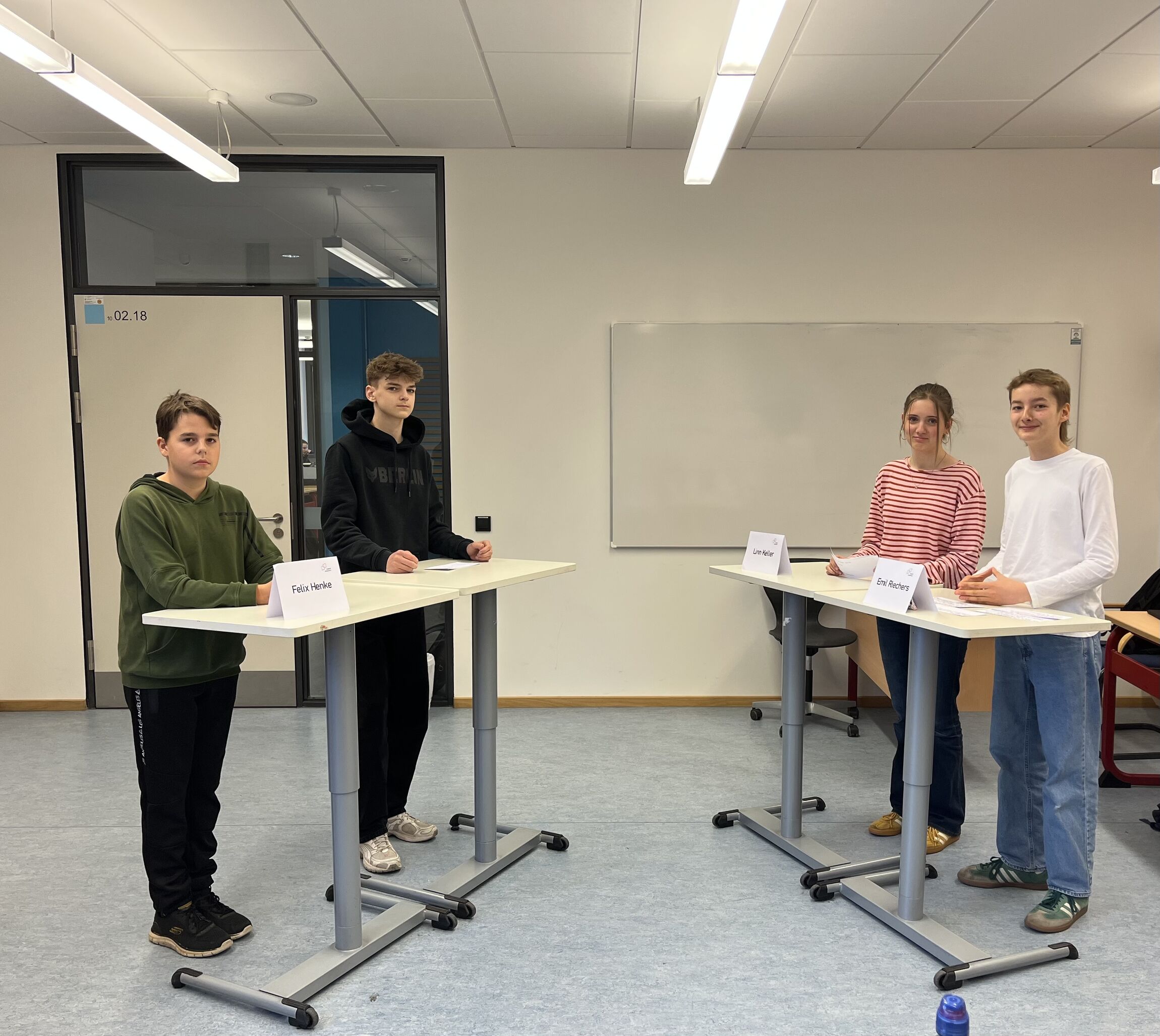 In spannenden Wortgefechten traten jeweils zwei Schüler*innen auf der Pro-Seite gegen zwei auf der Kontra-Seite an. Dabei zeigten alle Teilnehmenden großes rhetorisches Geschick, überzeugende Argumentation und Fairness im Umgang miteinander.
