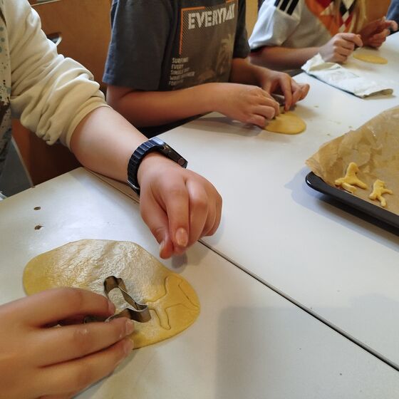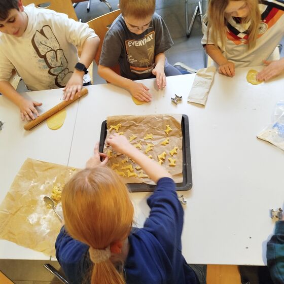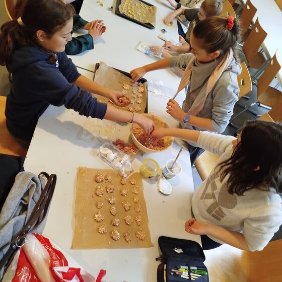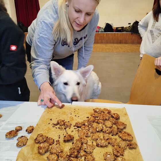 Die Hunde-AG wurde zur Weihnachtsbäckerei: Am AG-Dienstag ging es kurz nach dem 1. Advent ans Backen. Leberwurstgeschmack für die Eine(n) - die süße Variante für die Anderen. Auf alle Fälle hat es viel Spaß gemacht mit Schulhund Shira, die hier und da ihre Nase dazwischen hatte.