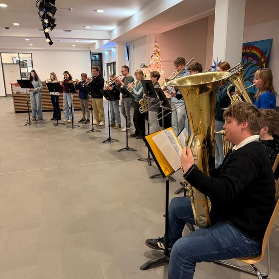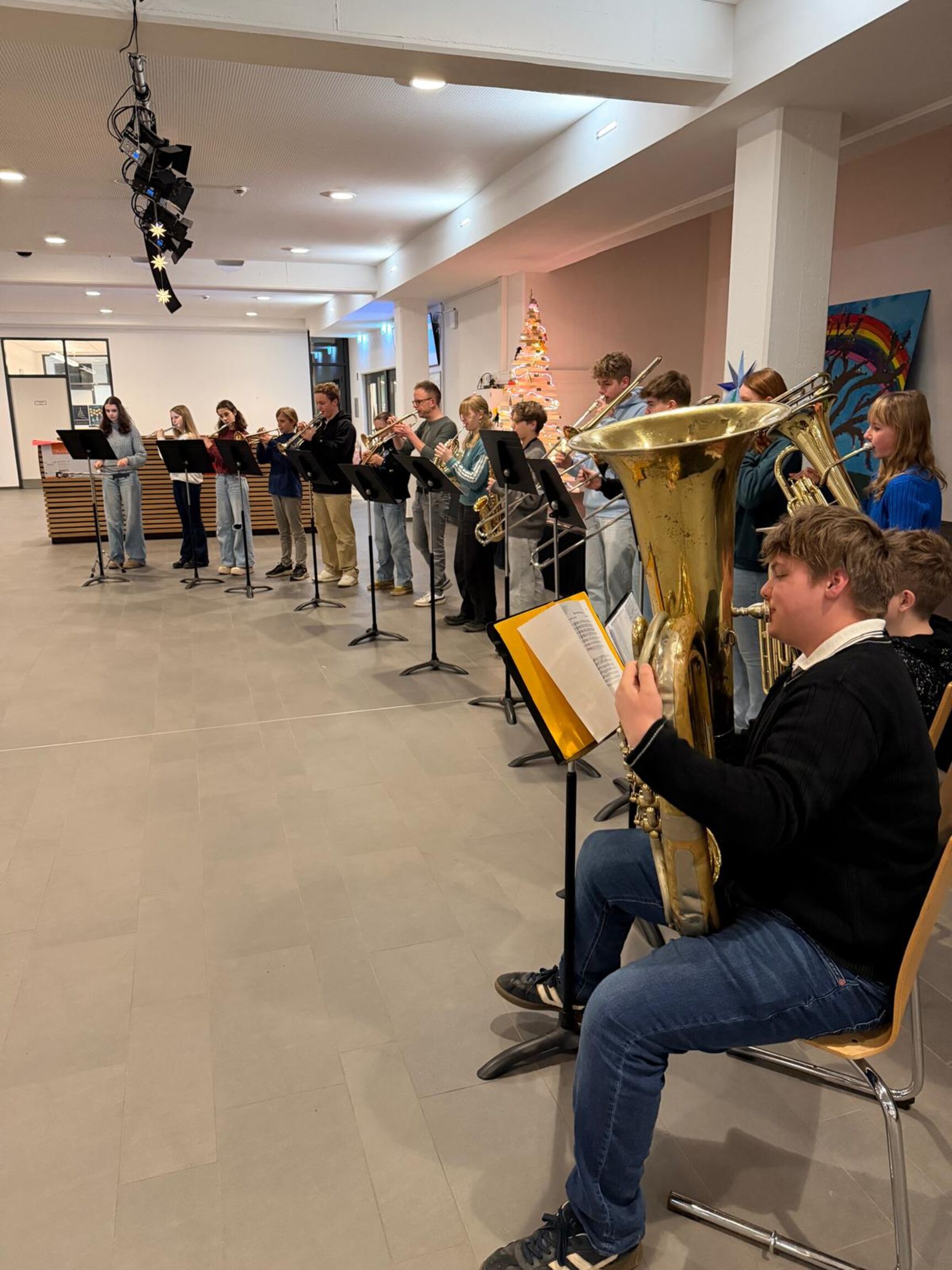 So kann der Tag beginnen: Wer heute (9.12.) ab 7 Uhr in unsere Pausenhalle kam, wurde von einem musikalischen Vorgeschmack auf das Adventskonzert am 17. Dezember (ab 17 Uhr) empfangen. Ein Teil der Bläserklassen ist extra früh aufgestanden, um mit Herrn Müller für das weihnachtliche Event zu proben. Hut ab – oder "Hut auf", wie die fröhlichen Damen vom Kiosk leuchtend unter Beweis stellten (s. Bildergalerie).