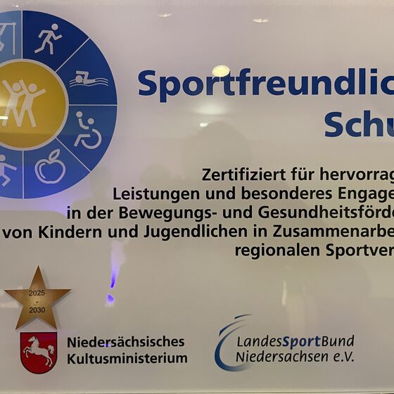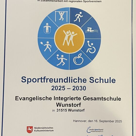 Jetzt haben wir es schriftlich: Die Evangelische IGS Wunstorf ist seit dem 16. September offiziell eine "sportfreundliche Schule". Die Zertifizierung für "hervorragende Leistungen und besonderes Engagement in der Bewegungs- und Gesundheitsförderung von Kindern und Jugendlichen in Zusammenarbeit mit regionalen Sportvereinen" gilt bis 2030.