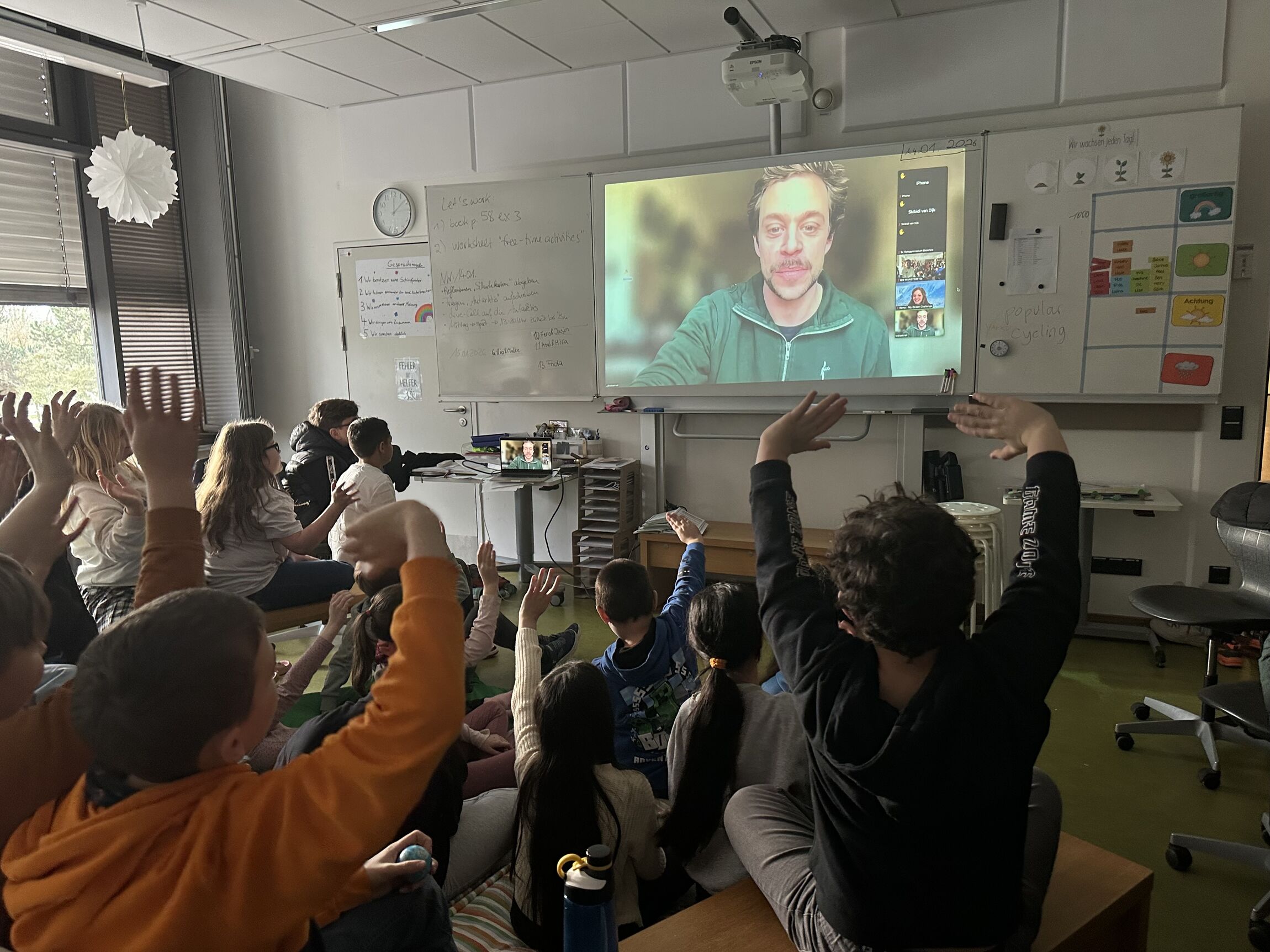 Ein absoluter Höhepunkt war die Teilnahme am Projekt „Globales Klassenzimmer – Live in die Antarktis“. Punkt 12 Uhr schaltete sich die Klasse – parallel mit anderen Klassen aus ganz Deutschland – live auf die Expeditionssegelyacht „Malizia Explorer“, oft gesteuert vom bekannten Segler und Klimabotschafter Boris Herrmann. Checker Tobi moderierte das Gespräch und interviewte Herrmann sowie die Klimaaktivistin Luisa Neubauer.