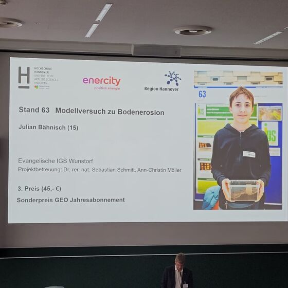 Julian (10d) trat im Fachgebiet „Geo- und Raumwissenschaften“ mit einem Projekt zur Bodenerosion an. Bodenerosion führt in Ländern wie dem Kongo dazu, dass der Boden aufreißt und ganze Gebäude verschluckt. Julian untersuchte dieses Phänomen mit erstaunlich einfachen Modellversuchen und konnte zeigen, welche Prozesse dabei eine Rolle spielen. Neben dem dritten Platz in Geo- und Raumwissenschaften erhielt er noch eine zusätzlichen Sonderpreis.