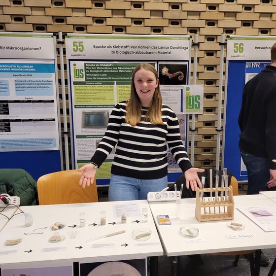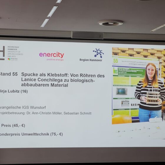 In einem zweiten Biologie-Projekt untersuchte Mirja (10e) wie Wohnröhren des Bäumchen-Röhrenwurms. Dieser baut im Watt Röhren, indem er den Sand mit seinem Speichel verklebt. Mirja untersuchte, aus was die Röhren bestehen, baute diese nach und lieferte damit die Grundlage für stabile, aber biologisch abbaubare Materialien. Damit konnte sie die Jury begeistern und erhielt neben dem 3. Platz Biologie auch einen Sonderpreis „Umwelttechnik“.
