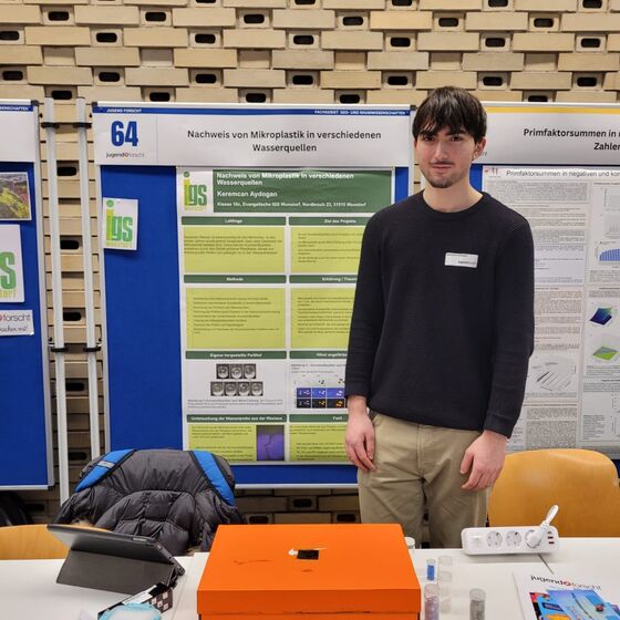 Ebenfalls für „Geo- und Raumwissenschaften“ trat Keremcan (10c) an. Er baute einen Nachweis für die Anreicherung und den Nachweis von Mikroplastik auf und untersuchte die Aue. Das beruhigende Ergebnis – auch wenn der Nachweis an sich funktioniert, fand er kaum Mikroplastik in der Aue.