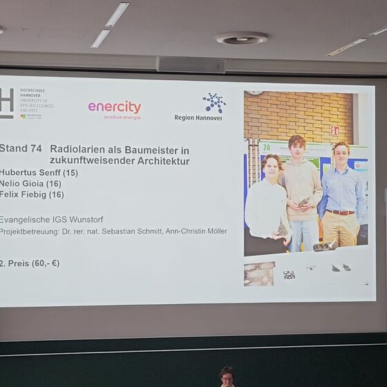 Ebenfalls von der Natur inspirieren ließen sich Hubertus, Felix und Nelio (10e). Sie untersuchten das stabile Skelett von Strahlentierchen (Radiolarien), indem sie die Strukturen zunächst mittels 3D-Druck erstellten und die Stabilität untersuchten. Dabei gingen sie der Frage nach, ob solche Strukturen möglicherweise materialsparende Strukturen für Dächer darstellen könnten. Damit erreichten Sie einen tollen zweiten Platz im Fachbereich „Technik“.