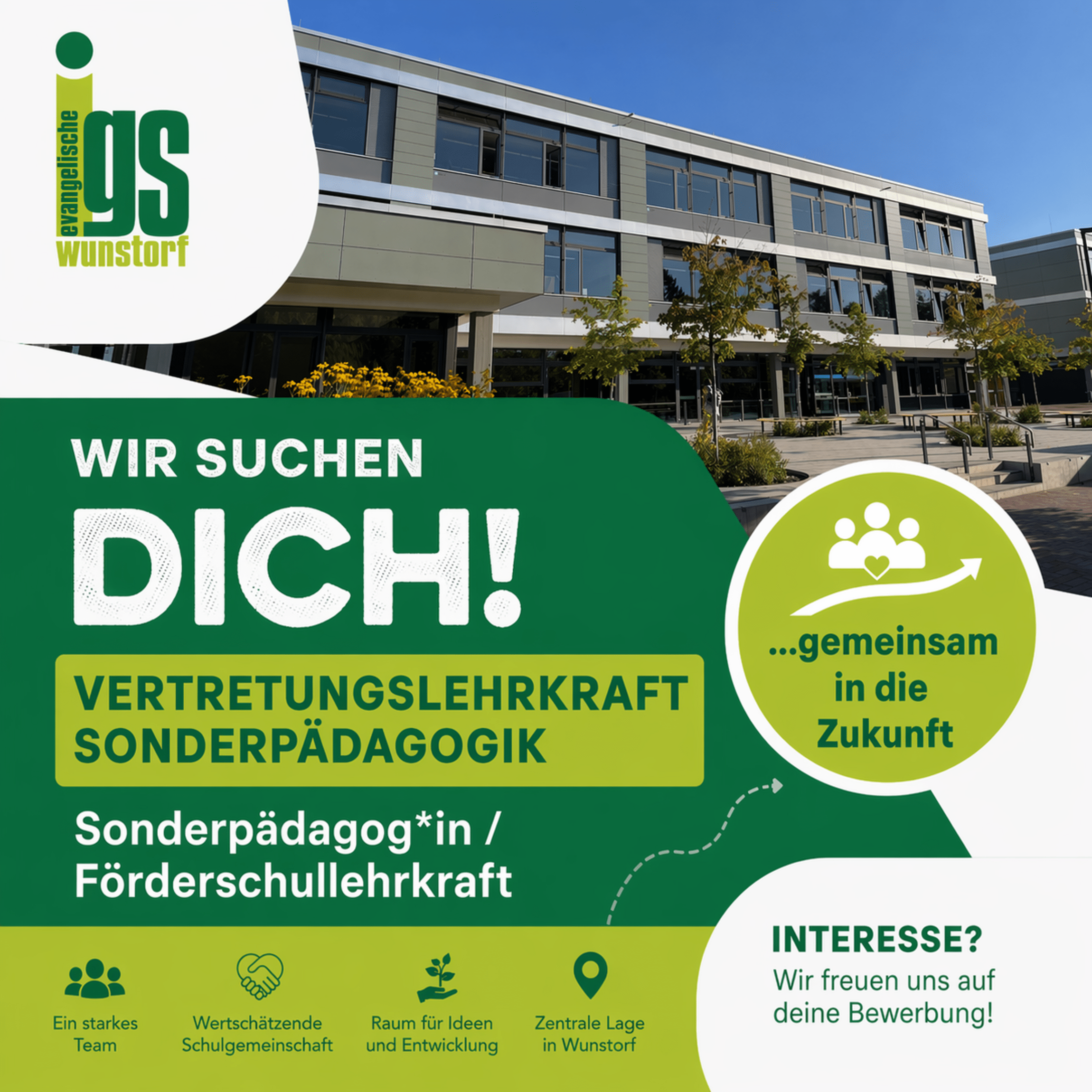 Der Fachbereich Sonderpädagogik/Inklusion der Evangelischen IGS Wunstorf sucht zum 1. August 2026 engagierte Verstärkung. Sie haben Lust, Schule aktiv mitzugestalten, inklusiv zu arbeiten und Teil eines offenen, vielfältigen Teams zu werden? Dann freuen wir uns auf Sie – gern zunächst in einem persönlichen Kennenlerngespräch oder direkt mit Ihrer Bewerbung.