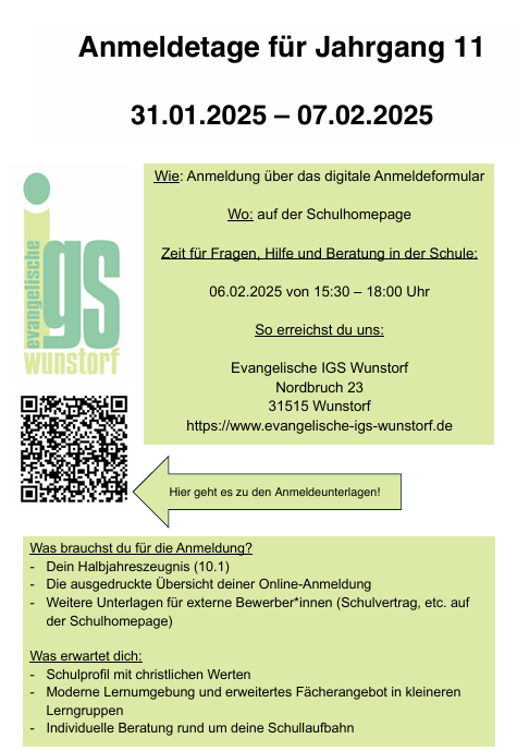 Ab heute bis zum 07. Februar 2025 finden die Anmeldetage zur gymnasialen Oberstufe an der Evangelischen IGS Wunstorf für das Schuljahr 2025/2026 statt.