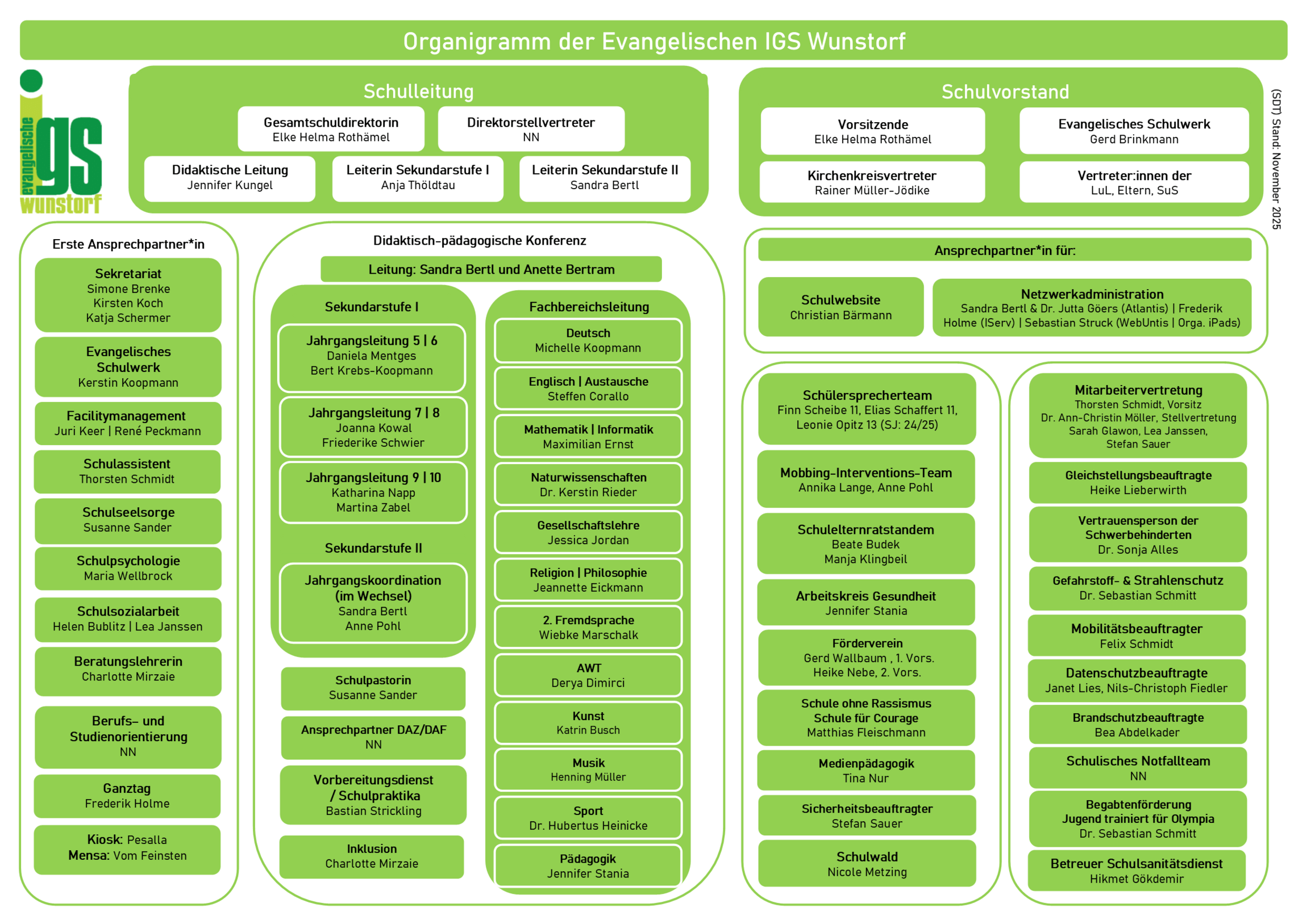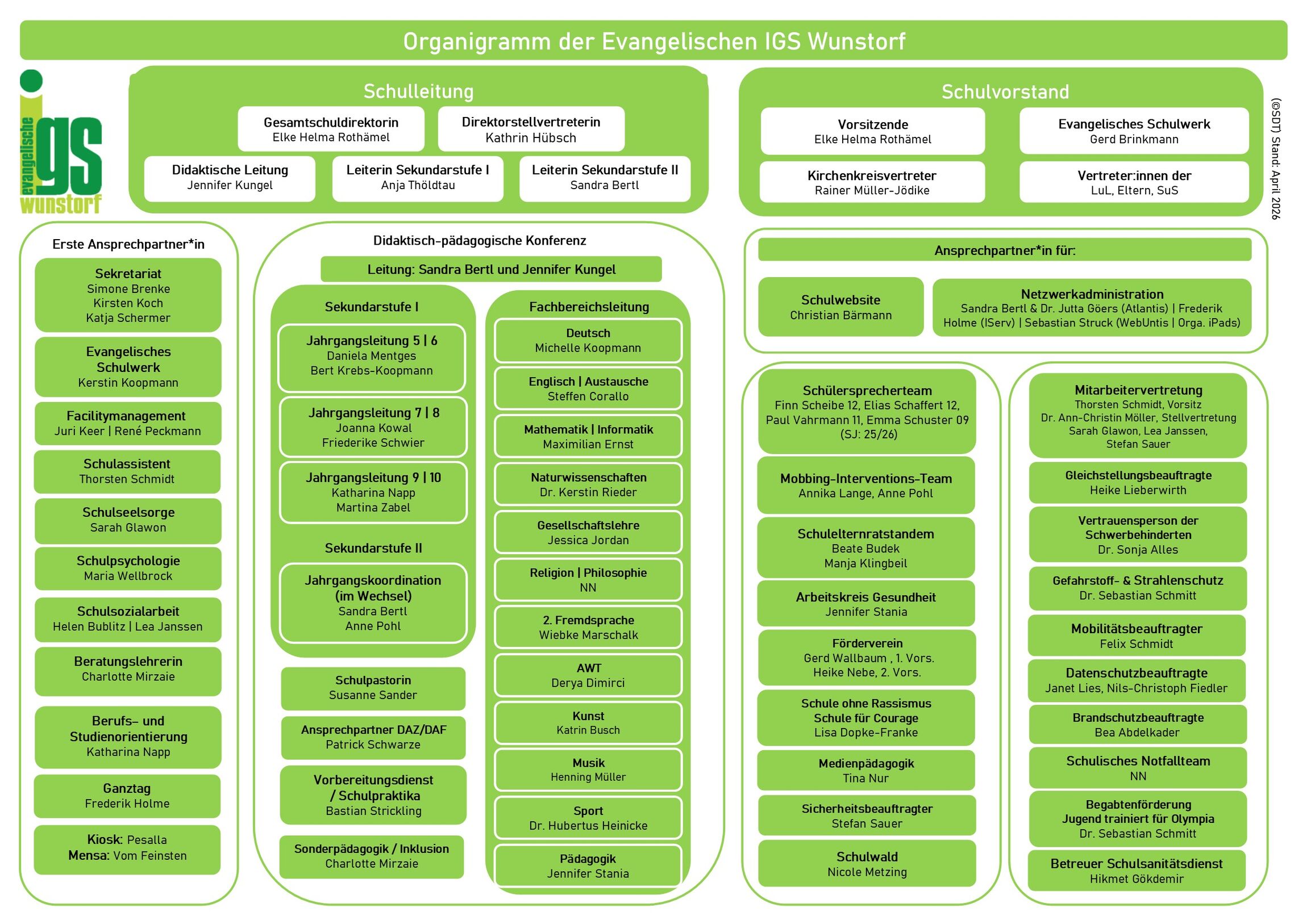 Die Evangelische IGS Wunstorf ist ein Ort, an dem Bildung und Gemeinschaft im Mittelpunkt stehen. Unser engagiertes Team arbeitet gemeinsam daran, eine inspirierende und unterstützende Lernumgebung für unsere Schüler*innen zu schaffen. Von der Schulleitung über das Kollegium und der Schulsozialarbeit bis zur Hausmeisterei: Gemeinsam sind wir mehr als nur eine Schule; wir sind eine Gemeinschaft, die sich um das Wohl und die Zukunft unserer Schüler*innen kümmert.